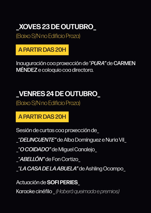 O venres 24 teremos unha sesión de catro curtametraxes que conectan no concepto de diversidade: ‘Delincuente’, de Alba Domínguez e Nuria Vil; ‘O Coidado’, de Miguel Canalejo; ‘Abellón’, de Fon Cortizo e ‘La casa de la abuela’, de Ashling Ocampo. A noite rematará cun concerto da cantante coruñesa Sofi Peries e un concurso de karaoke cinéfilo.
