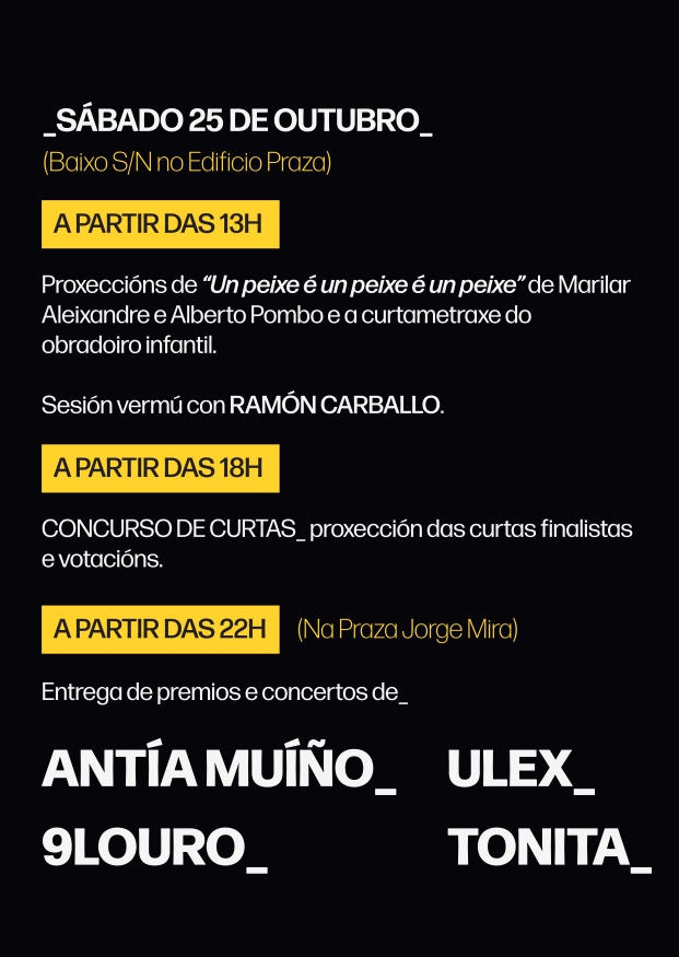 O sábado 25 de outubro a partir das 18h celebrarase o concurso de curtas, no que se proxectarán as pezas finalistas entre as presentadas, e o público poderá votar. A partir das 22h, na praza Jorge Mira, festexaremos na gala final coa entrega de premios e posteriores concertos de Antía Muíño, Ulex, 9Louro e Tonita. Pola mañá, a partir das 12h, haberá proxeccións e unha sesión vermú.